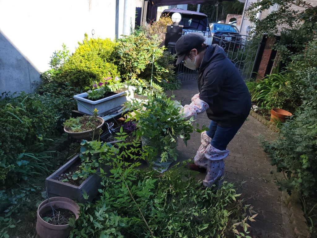 訪問した際に「お身体はだいじょうぶ?お元気?」と声かけをしてからスタート。5名のサポーターで約2時間かけて綺麗に草がなくなりました。